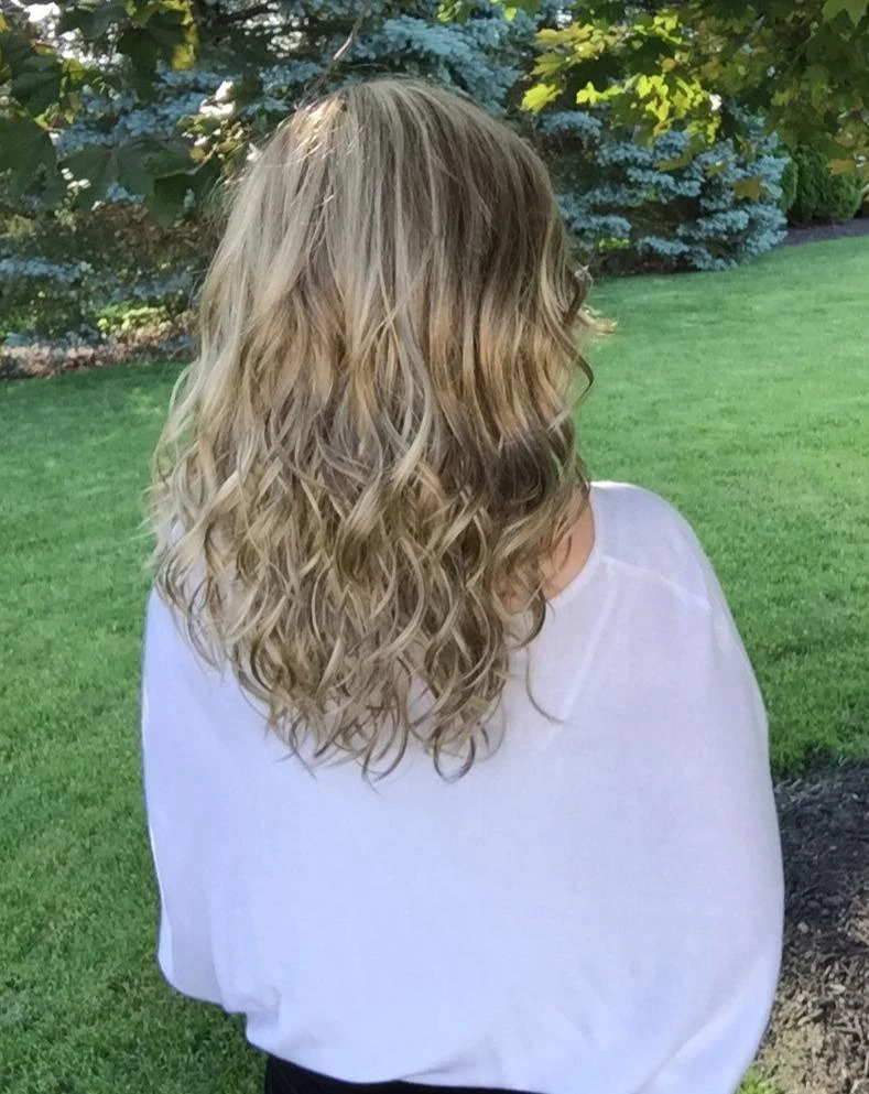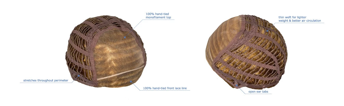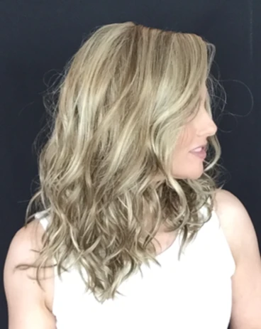 Gorgeous layers with long, loose waves define this stunning style. Alden’s monofilament top with a front lace line will give you an effortlessly natural look with the freedom to style her how you want with below the shoulder style with layers & soft waves.