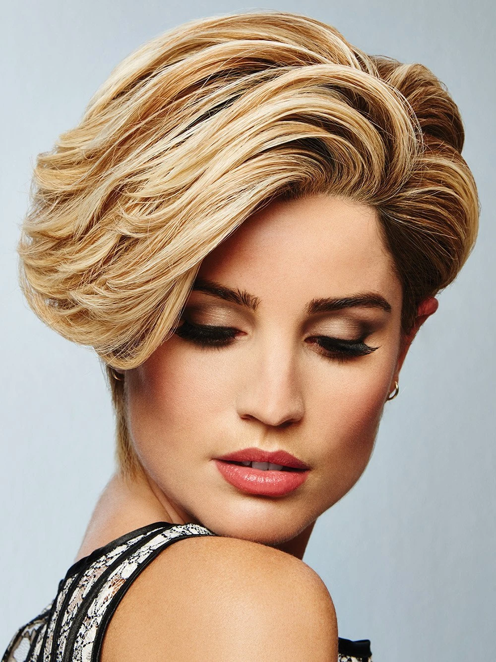 The Calling All Compliments Wig by Raquel Welch features a French Drawn lace front and a monofilament top, which allows for versatile styling options with this timeless, short style.