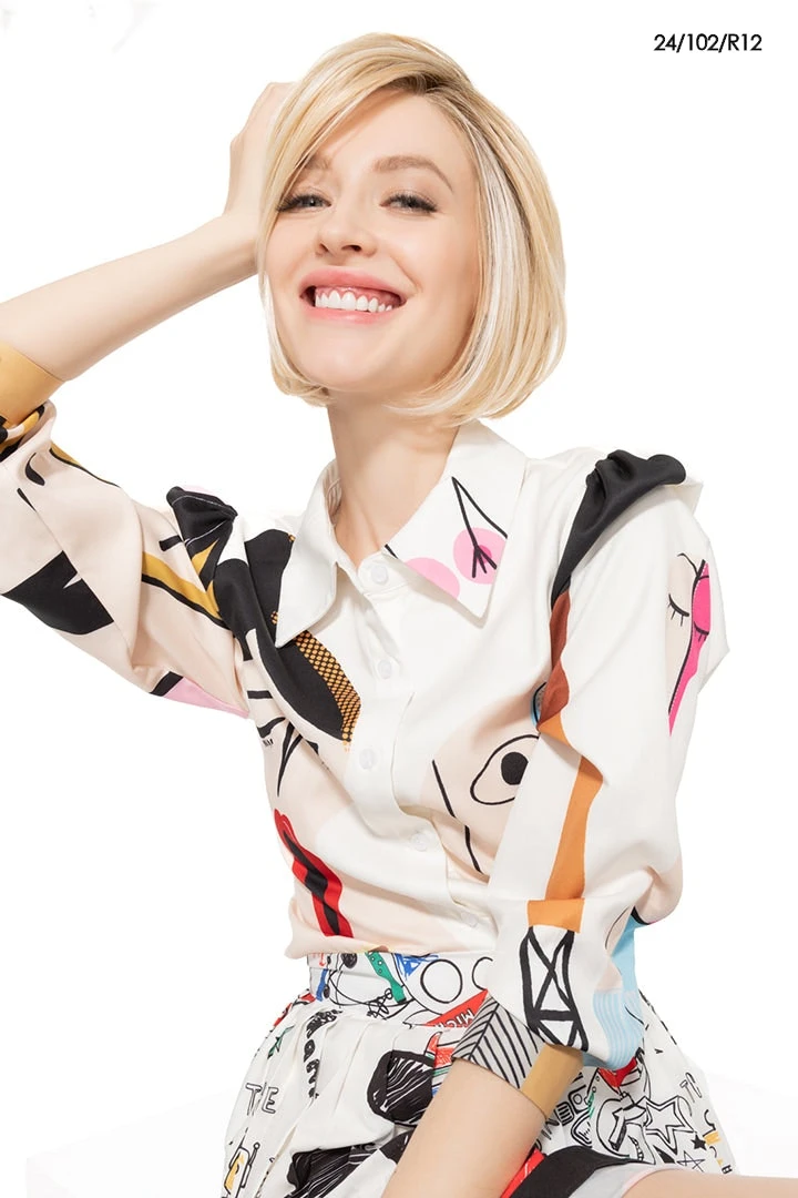 A trendy short asymmetric bob haircut that’s realistic, stylish, light and comfortable, full of energy, and ready to wear. Low-density chin-length layers with sweeping bangs that can brush in any direction and a bobbed back that slightly extends to the nape.Â